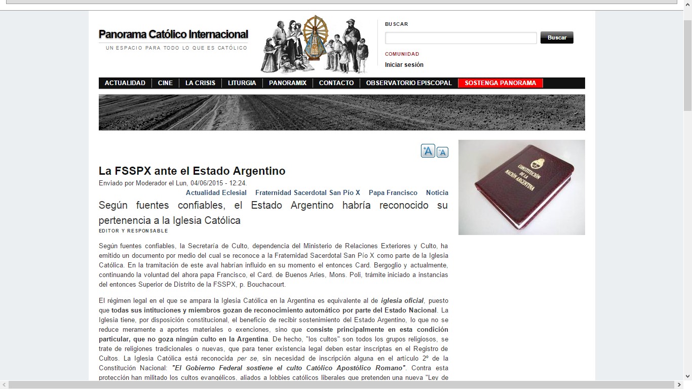 El día 6 del corriente mes de Abril, el tibio sitio Panorama Católico Caótico, publicó un artículo titulado «La FSSPX ante el Estado Argentino«:
