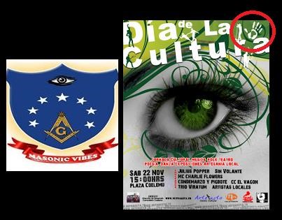 Finalmente, para no adelantar la convergencia simbólica que trataremos más adelante, mostramos sólo dos ejemplos donde aparece el “ojo luciferino-masónico y la mano que es su complemento y culminación revolucionaria”.