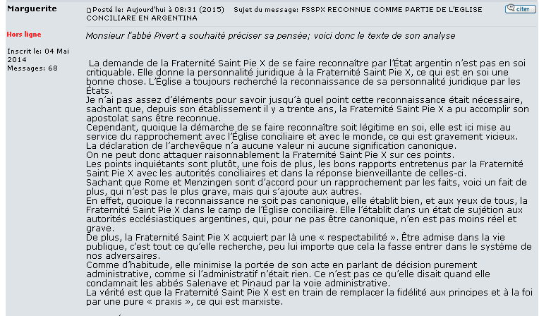 Porque convengamos que a las palabras del Padre Pivert (tales como La declaración del arzobispo no tiene ningún valor ni ninguna significación canónica (…) Aunque el reconocimiento no sea canónico (…) Sometimiento no canónico) contradicen estas otras del jurista argentino H. T.: Dijo el Arzobispo Poli, sucesor de los Apóstoles y miembro del Colegio Cardenalicio, en su presentación ante la Secretaría de Cultos, que la FSSPX es una persona jurídica pública dentro de la Iglesia y conforme las normas del Código de Derecho Canónico. Ergo, tiene una situación canónica regular como persona pública dentro de la Iglesia.