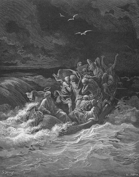 En plena noche, mientras los discípulos estaban en la barca, se levantó una tempestad y ellos sintieron mucho miedo. En el Evangelio según San Juan, en el capítulo VI, 16-20, leemos esta anécdota: