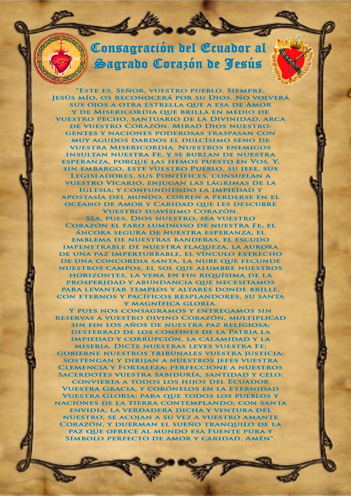 El mayor bien de un pueblo es conservar intacta la fe católica; este bien no depende de nuestros méritos, sino de la misericordia de Dios, que obtendrá la nación si se arroja con humildad en el Corazón de Jesús. Por consecuencia, el Concilio de Quito ofrece y consagra solemnemente la República al Sagrado Corazón, suplicándole que sea su protector, su guía y su defensor, a fin de que nunca se separe de la fe católica, apostólica, romana, y que los habitantes del Ecuador, conformen su vida, con esta fe y en ella encuentren su felicidad en el tiempo y la eternidad.