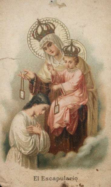 «Recibe, hijo querido, este Escapulario de tu Orden como signo distintivo de mi confraternidad y privilegio que yo he obtenido para ti y para todos los hijos del Carmelo. Quien muriese revestido de este hábito será preservado de los fuegos eternos del infierno. Esta es señal de salvación, defensa en los peligros, confederación de paz y pacto sempiterno»