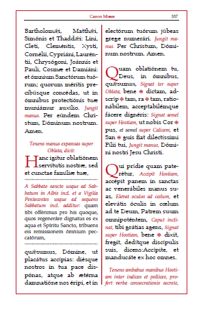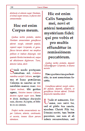 b) Las nuevas puntuaciones de las palabras y la nueva tipografía. En efecto, en el antiguo Misal el mismo punto y aparte significaba claramente el paso del modo narrativo al modo sacramental y afirmativo, las mismas palabras consagratorias se trazaban en el antiguo Misal con letras mayúsculas y en el medio de la página; más aún, con frecuencia escritas también en color diferente, de manera que se separasen del contexto meramente histórico, y todas estas cosas, por cierto, conferían sapientísimamente a toda la fórmula consagratoria una fuerza propia de significación absolutamente individual y singular.