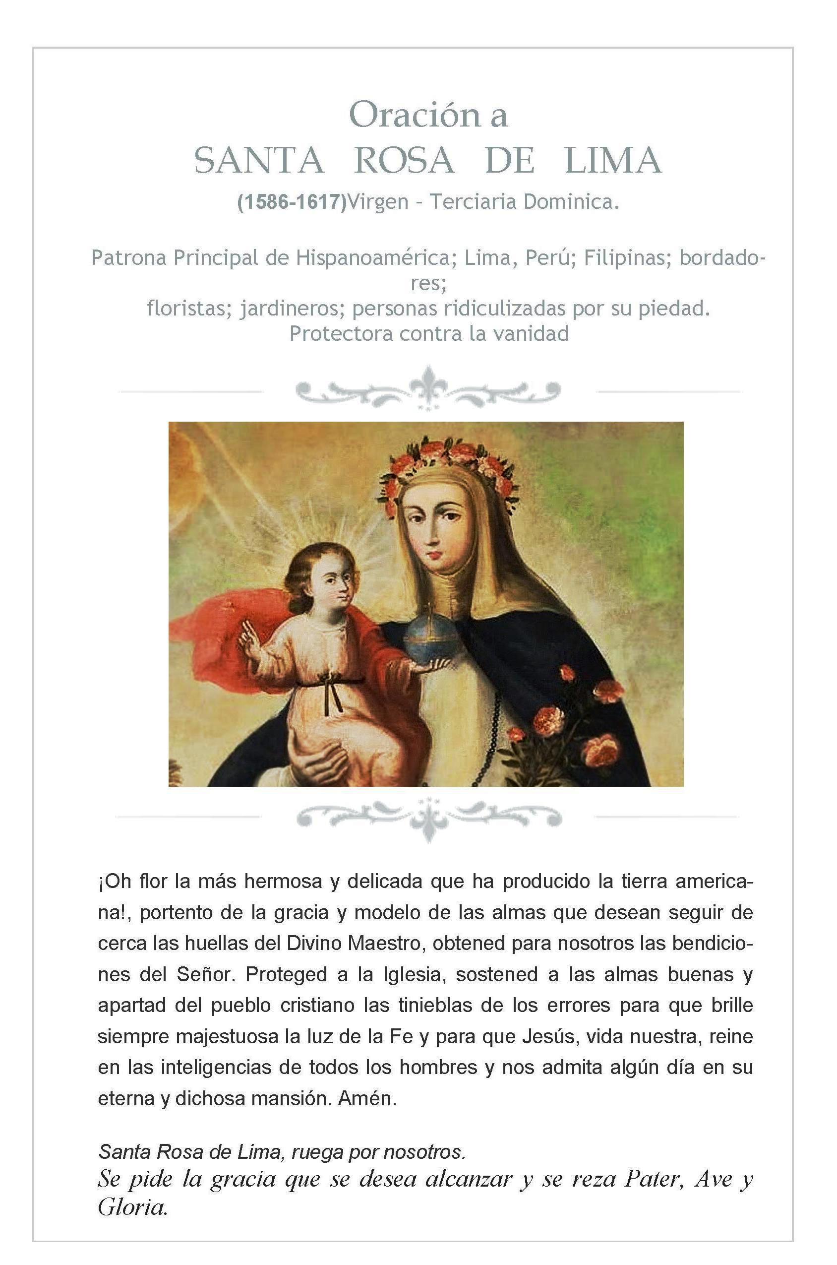Dulcísimo Jesús, que por nuestro amor os hicisteis Niño; dándoos el Padre Celestial un Nombre sobre todo nombre, para que ante Él doble la rodilla cuanto existe en los cielos, en la tierra y en los abismos. Os adoramos y reverenciamos en esta preciosa Imagen, interponiendo el valimiento de Santa Rosa, Hermana nuestra, para conseguir toda clase de bienes espirituales y temporales. Concedednos, por su intercesión, la gracia de invocaros con fervor, serviros con fidelidad, y amaros sin cesar, de tal manera que seáis como la respiración incesante de nuestro espíritu; y protegidos por la virtud omnipotente de vuestro Nombre, logremos pasar sin riesgo las tempestades de esta vida y en la hora de nuestra muerte exhalemos nuestro último suspiro repitiendo como vuestra esposa Rosa de Lima: «Jesús, Jesús, sea conmigo». Amén.