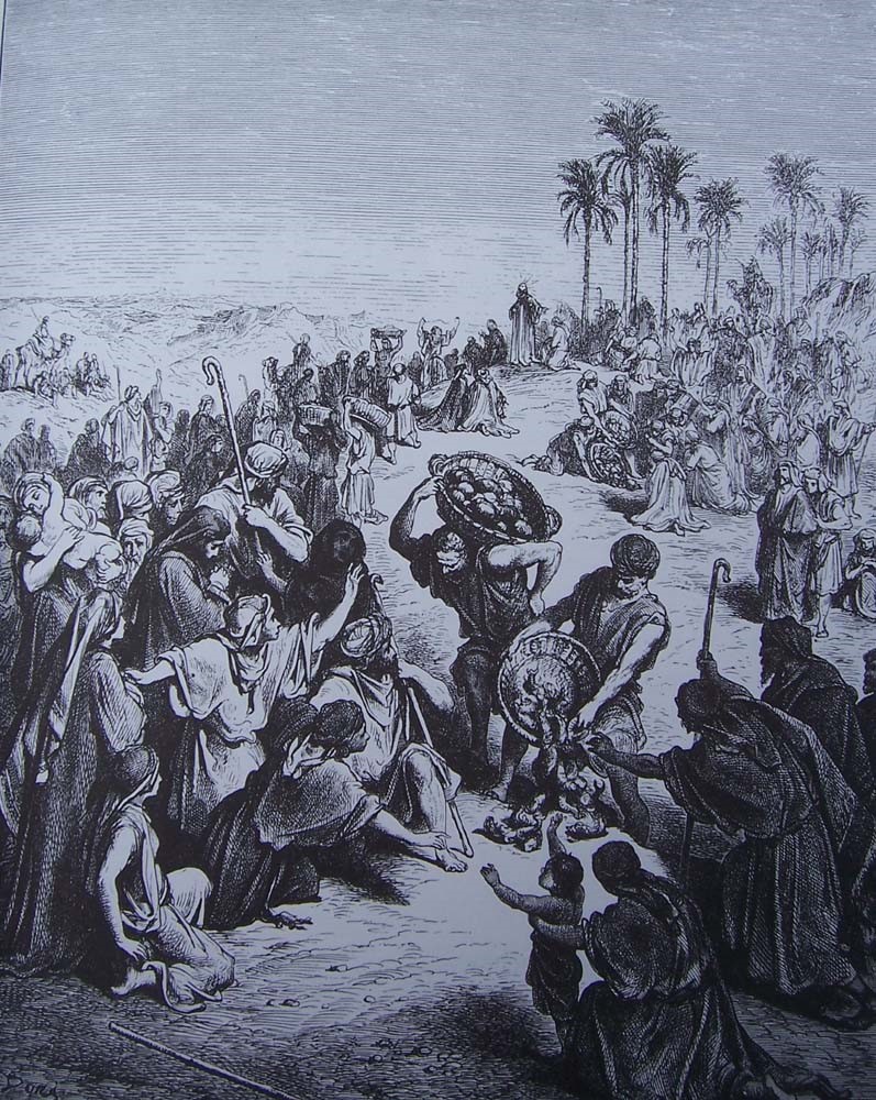 “Al levantar Jesús los ojos y ver que venía hacia él mucha gente, dice a Felipe: «¿Dónde vamos a comprar panes para que coman éstos?» Se lo decía para probarle, porque él sabía lo que iba a hacer. Felipe le contestó: «Doscientos denarios de pan no bastan para que cada uno tome un poco.» Le dice uno de sus discípulos, Andrés, el hermano de Simón Pedro: «Aquí hay un muchacho que tiene cinco panes de cebada y dos peces; pero ¿qué es eso para tantos?» Dijo Jesús: «Haced que se recueste la gente.» Había en el lugar mucha hierba. Se recostaron, pues, los hombres en número de unos 5.000. Tomó entonces Jesús los panes y, después de dar gracias, los repartió entre los que estaban recostados y lo mismo los peces, todo lo que quisieron”.