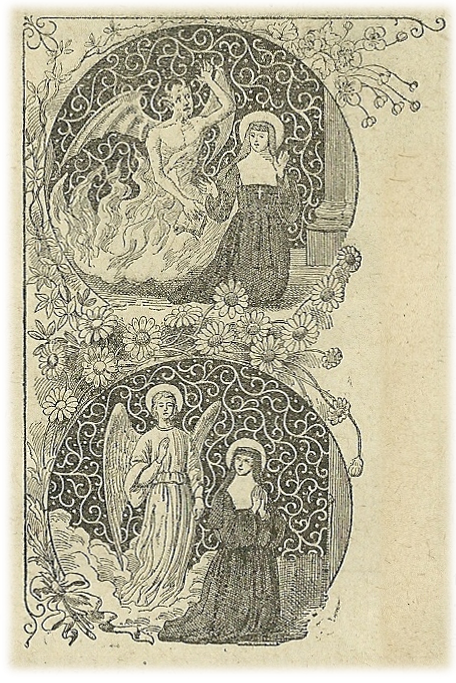 Mientras más adelantaba en Santidad Margarita María, más la perseguía, con sus furiosos dardos, el demonio. Desesperado de no haber podido encadenar esta alma bajo su yugo infernal, quería vengarse en su cuerpo, y al efecto, durante mucho tiempo suscitó mil vejaciones a la Sierva de Dios, haciéndola inhábil para todas las ocupaciones y que se le cayesen y rompiesen los objetos que llevaba, o bien le quitaba furtivamente la silla donde se sentaba, tirándola al suelo de repente hasta tres veces seguidas. Un día llegó su malicia a precipitarla desde lo alto de una escalera; pero allí, debió declararse vencido, pues Margarita María se levantó sin haber sufrido el menor daño. Su ángel custodio la protegió, así como un segundo ángel, escogido entre los Serafines, al cual había cometido Nuestro Señor el cuidado especial de su bienaventurada discípula. Gozaba siempre de la presencia sensible de este celestial protector, y teniendo el honor de hablar familiarmente.