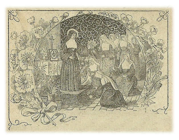 La Bienaventurada acababa de ser nombrada maestra de las novicias ( Enero de 1685). Desde sus primeras enseñanzas a aquellas almas inocentes, no había dejado de hablarles del Corazón Sagrado de Nuestro Señor. Encantada del modo con que acogían sus instrucciones, la fervorosa directora cobró ánimo, y cuando llegó el tiempo en que debían felicitarle su día ( 20 de Julio) rogó a las novicias hiciesen al Corazón de Jesús todos los pequeños obsequios que tenían intención de darle a ella misma. Un transporte lleno de la más ingenua y tierna piedad respondió a este llamamiento. Se dibujó una imagen del Sagrado Corazón ( las antiguas memorias dicen que esta primera imagen fue dibujada con tinta) y todo el día se pasó en alabanzas y bendiciones dadas al Corazón humildísimo y dulcísimo de Jesús por este pequeño y selecto rebañito.