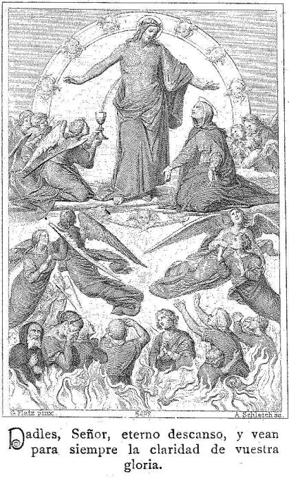 A tan dulce anuncio, ¿qué diría aquella Alma? ¡Oh! Benedicti vos a Domino, qui fecistis misericordiam servo suo. Imaginad ¡con qué aire de alegría saldría de aquellas llamas! ¡Cómo se le imprimirían profundamente en la memoria los amados nombres de sus piadosos libertadores!