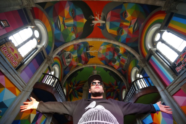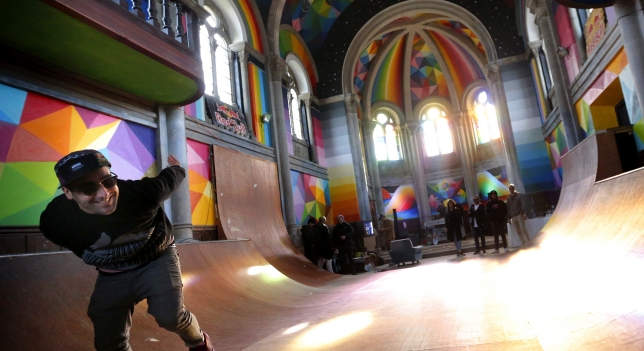 Siete jornadas, a razón de doce horas diarias, empleó para llenar el templo de formas geométricas, color y algunas de las constantes de su obra. Okuda San Miguel conoció la iglesia por casualidad a través de las redes sociales, y contactó con el colectivo de patinadores asturianos Church Brigade, responsable de la conversión del espacio en un Skatepark Indoor. «Desde que vi este espacio, me enamoré de él», explicó. Y tras visitarlo, confesó que «no podía sacarme la idea de la cabeza de volver para pintarlo».