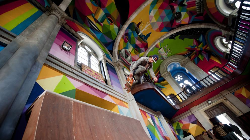 El artista multidisciplinar Okuda San Miguel ha inaugurado su obra ‘Kaos Temple’, pintada sobre los muros, las bóvedas y las vidrieras de la iglesia desacralizada de Santa Bárbara, en Llanera (Asturias). La obra se ha financiado gracias a una campaña de ‘crowdfunding’. En el interior de esta antigua iglesia está instalado un ‘skatepark indoor’ en donde los patinadores disfrutan de la obra de Okuda.
