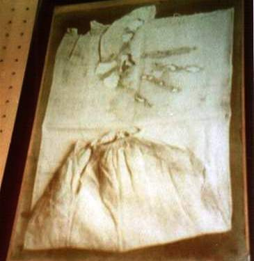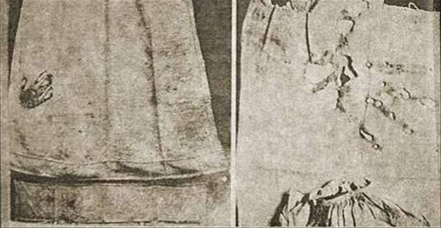 En la túnica se pueden ver las marcas de la quemadura, mientras que en la camisa se ven marcas chamuscadas y algo que se dice es sangre.