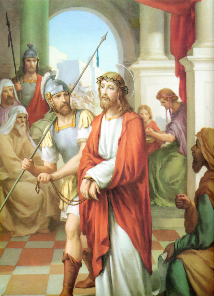 «Reo es de muerte», dijeron de Jesús los miembros del Sanedrín, y, como no podían ejecutar a nadie, lo llevaron de la casa de Caifás al Pretorio. Pilato no encontraba razones para condenar a Jesús, e incluso trató de liberarlo, pero, ante la presión amenazante del pueblo instigado por sus jefes: «¡Crucifícalo, crucifícalo!», «Si sueltas a ése, no eres amigo del César», pronunció la sentencia que le reclamaban y les entregó a Jesús, después de azotarlo, para que fuera crucificado.
