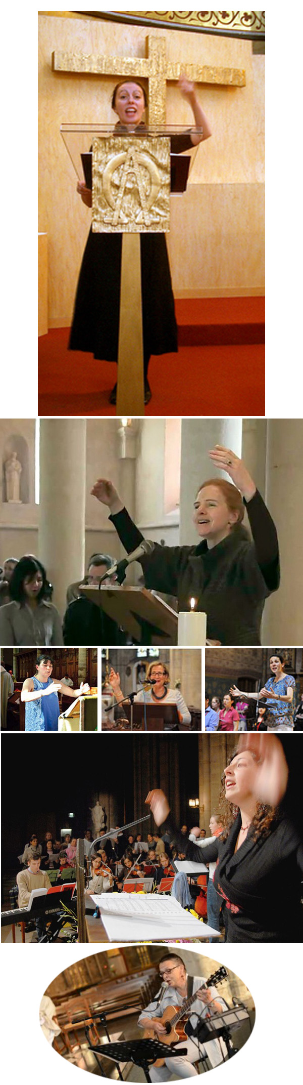 A continuación la primera fila , la Iglesia de Saint Eustache, París,segunda fila Iglesia de San Martín de Verneuil en Vernouillet; tercera fila izquierda , Abbay d’Ourscamp; centro , una iglesia no identificada publicado en el sitio Obispos de Francia; la derecha ., animación en Rueil Malmaison cuarta fila, la animación por parte del equipo de la Croixperiódico en una iglesia en París, quinta fila , una cantante mujer con un corte de pelo como hombre en Merville que se está ocupado en toda Francia para «animar» matrimonios; sexta fila , un conjunto de «animadoras» en una capilla en Niza; séptima fila , Notre-Dame- du-Pré, Mans. Octava fila de la izquierda , una iglesia no identificada en Gazeran;la derecha , San Francisco de Sales en Chambéry catedral; novena fila , Iglesia de Saint Eloi, París; décima fila de la izquierda , la catedral de Créteil; derecha , Iglesia de St. Bernadette en Bruilhois; última fila , la catedral de Chartres.