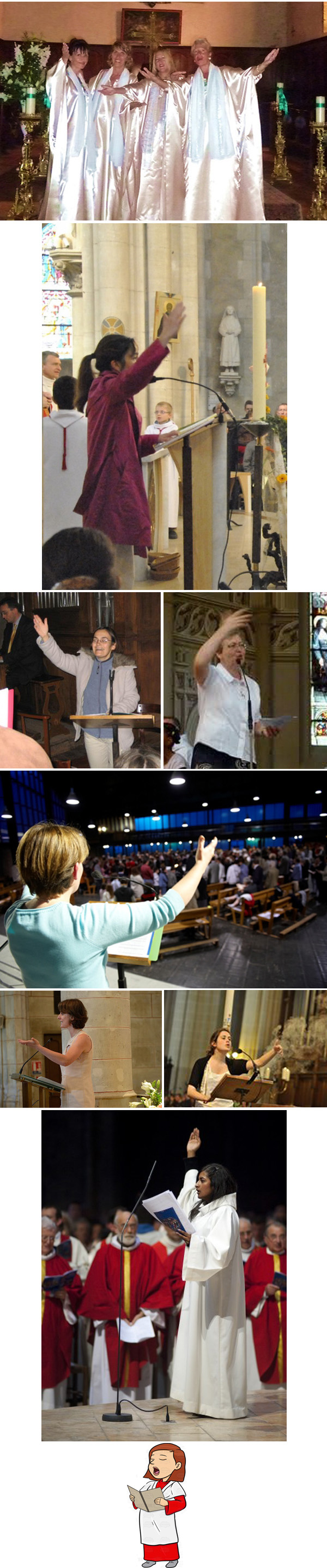Por lo tanto, en todas partes hoy en día nos encontramos con las mujeres en el altar como «animadores litúrgicos,» además de su papel como niñas en el altar y casi-diáconos que actúan como auxiliares de los sacerdotes durante la misa.