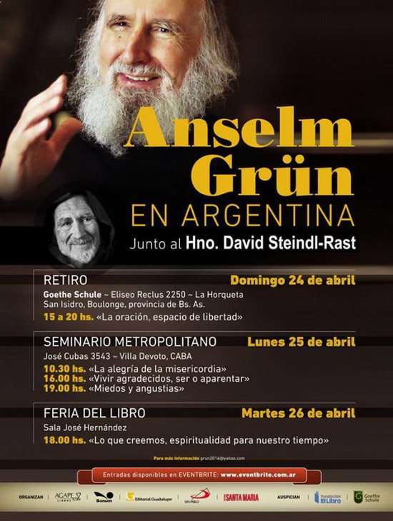 “El monje benedictino alemán Anselm Grün visitará la Argentina, junto con el hermanoDavid Steindt-Rast. El domingo 24 de abril, de 15 a 20, predicarán un retiro en el Colegio Goethe (Eliseo Reclus 2250, La Horqueta, San Isidro), donde reflexionarán sobre “La oración, espacio de libertad”, y el lunes 25 dictarán una serie de conferencias en el Seminario Metropolitano (José Cubas 3543, Villa Devoto). Hablarán sobre “La alegría de la misericordia”, “Vivir agradecidos, ser o aparentar” y “Miedos y angustias” http://www.aica.org/22668-anselm-grun-dictara-conferencias-predicara-un-retiro-en-la-argentina.html