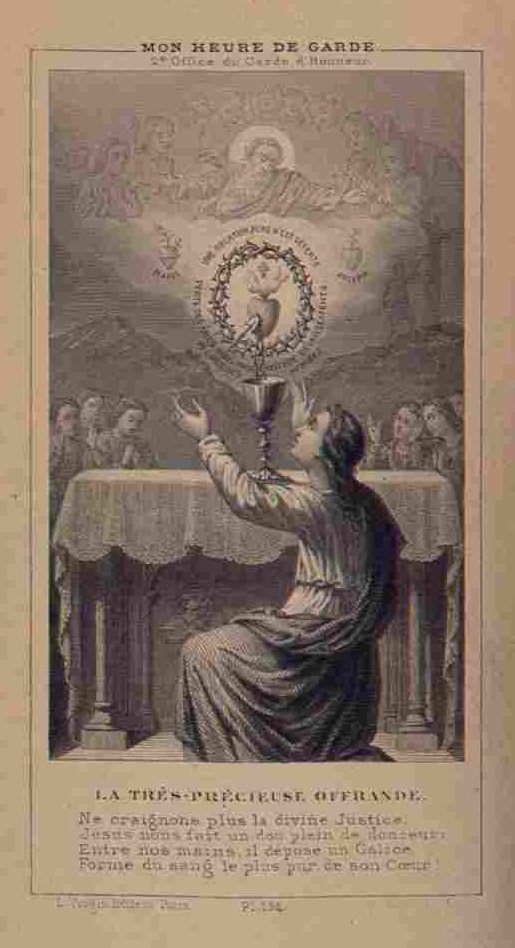 Si los crímenes rebosan; si la iniquidad sobreabunda; que, millares de Guardias de Honor, con las manos elevadas al cielo, interpongan sin cesar entre los pecados de los hombres y la justicia de Dios, el cáliz de bendición que les ha confiado su buen Maestro; y que con una voz suplicante suba sin interrupción, hasta la divina Majestad ultrajada, esta tierna oración, bendecida, aprobada y recitada tan eficazmente por el dulce é inmolado Pío IX.: