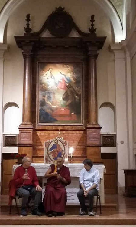 La foto de arriba muestra al monje budista principal en frente del altar en el presbiterio en donde da una charla a los católicos de Ravenna.