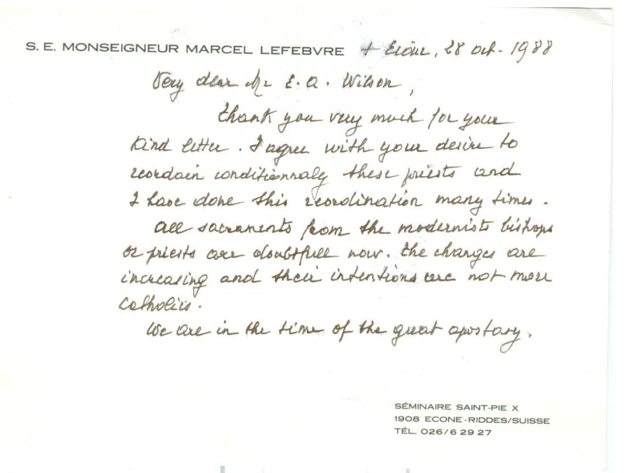 Publicamos el original en inglés y la traducción de la carta de Monseñor Lefebvre, respecto de que hay que reordenar bajo condición y por si fuera poco, que estamos en el tiempo de la Gran Apostasía, luego, tiempos eminentemente apocalípticos, lo cual estrictamente niegan y rechazan.