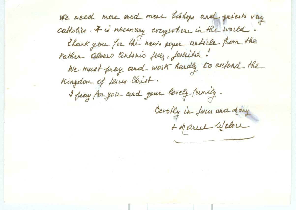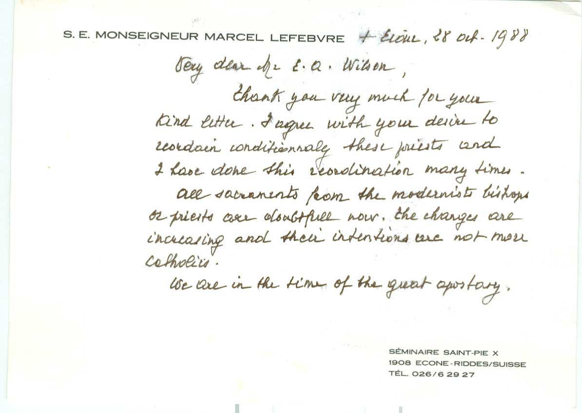 PD/. Aprovecho también para que tengan los fieles la carta completa de Mons. Lefebvre sobre las ordenaciones bajo condición y le envío copia de ella así como de la traducción.