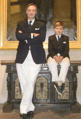 En la imagen de arriba , un padre y un hijo posan bajo un retrato de familia. El padre está vestido con una chaqueta de traje azul marino con un pañuelo de bolsillo, una camisa blanca abotonada con gemelos y corbata, pantalones blancos quebradizos con un cinturón de cuero, y mocasines de cuero ocasionales, pero sin embargo refinados. Su hijo imita el vestido con orgullo de su padre hasta el más mínimo detalle.