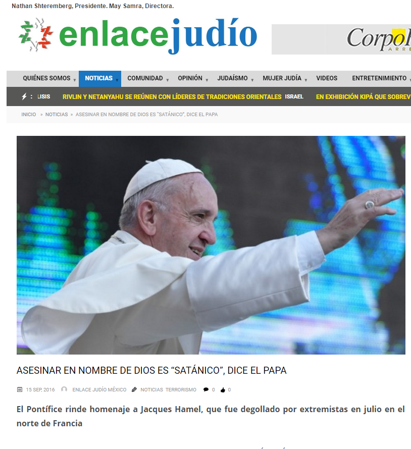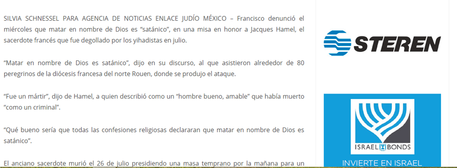 SILVIA SCHNESSEL PARA AGENCIA DE NOTICIAS ENLACE JUDÍO MÉXICO – Francisco denunció el miércoles que matar en nombre de Dios es “satánico”, en una misa en honor a Jacques Hamel, el sacerdote francés que fue degollado por los yihadistas en julio.