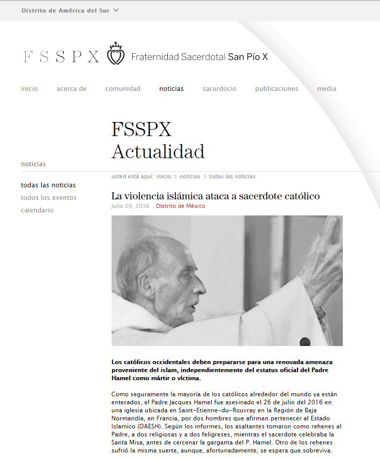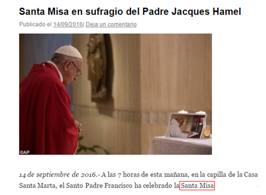 Mientras la “tradicionalista” fsspx, o mejor dicho: mientras la judaizada NEOfraternidad dice correctamente que el P. Hamel fue asesinado (NO MARTIRIZADO) incorrectamente dice que celebraba la “Santa Misa” sic. Por otro lado el sitio oficial del judaísmo en México dice que el P. Hamel fue asesinado mientras presidía una ¡MASA!, por lo menos este sitio anticatólico dice la verdad, porque el rito bastardo de Montini para los necios “tradis” debería por lo menos ser considerado eso, una MASA, aunque el verdadero CATÓLICO considera ese rito bastardo como un rito AGRADABLE AL DEMONIO.