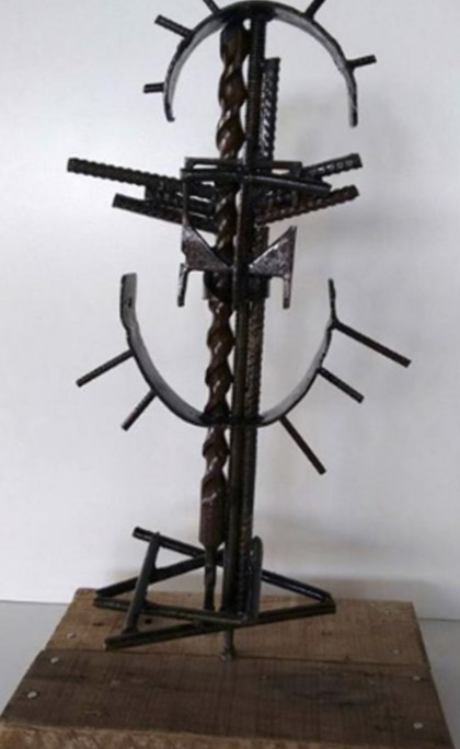 Se trata de una pieza de un poco menos de un metro de alto, confeccionada con materiales de descarte ferroviario y metales.