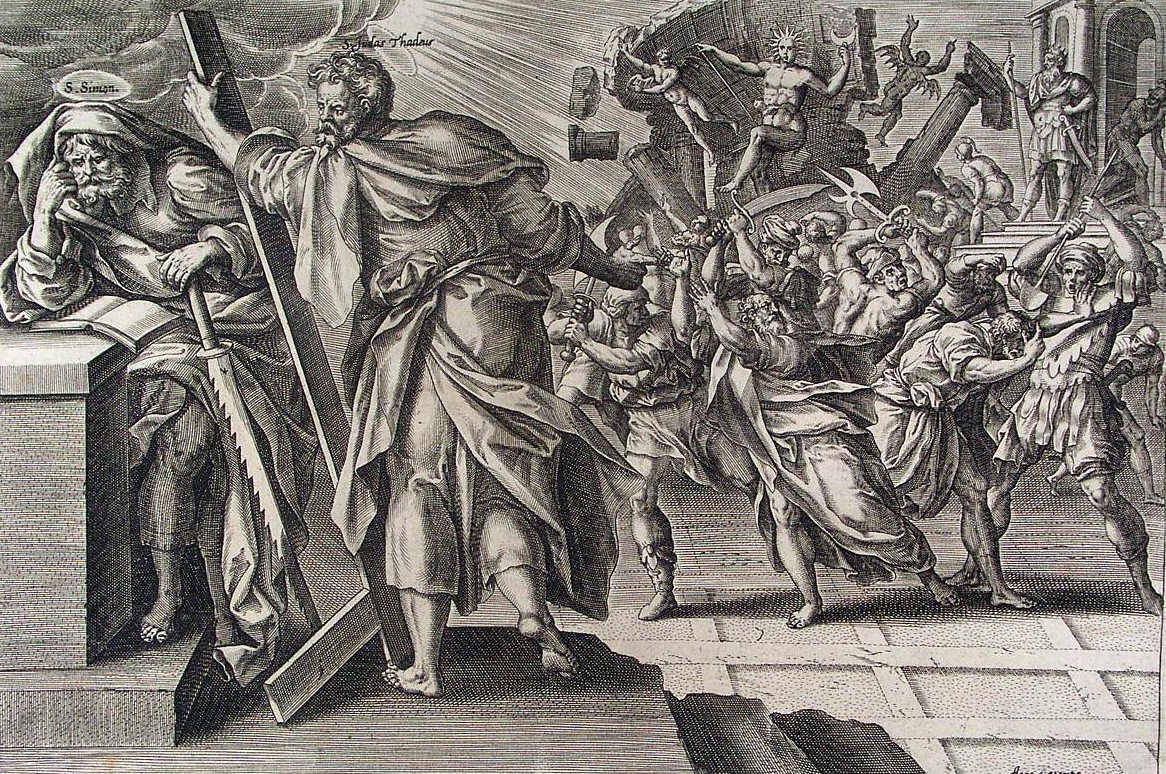 San Simón, de Caná en Galilea, y San Judas Tadeo, hijos de María de Cleofás y primos de Jesús, fueron a predicar el Evangelio, uno a Egipto, el otro a Mesopotamia. Después de treinta años de trabajos apostólicos, fueron llamados a Persia, en donde convirtieron a gran número de paganos. Las imágenes del sol y de la luna se quebraron cuando ellos lo ordenaron, y los demonios salieron de sus templos y emprendieron la fuga bajo la forma de negros etíopes. Los paganos, excitados por dos magos, se arrojaron sobre los santos apóstoles y los masacraron. Los instigadores del crimen perecieron fulminados por un rayo.