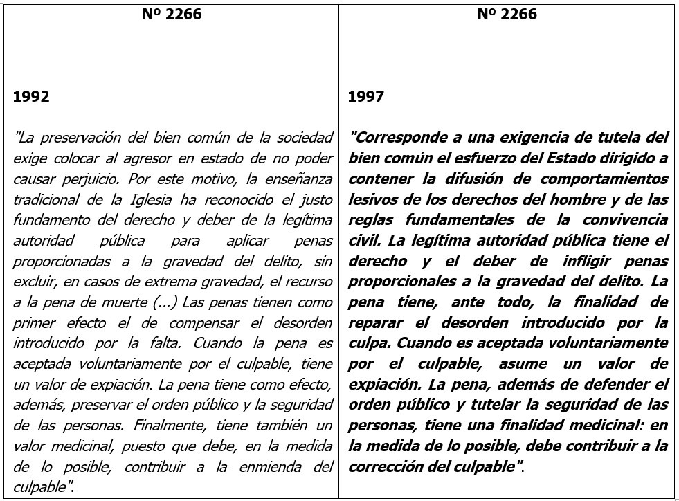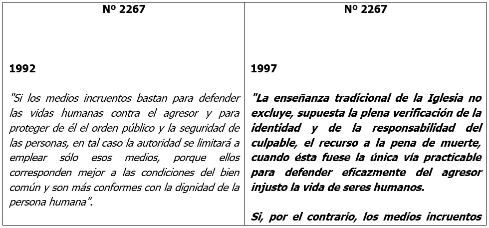 La redacción definitiva agrava todo esto puesto que, invocando en su favor «la enseñanza tradicional de la Iglesia», el número 2267 introduce una modificación importante al texto primitivo del número 2266 (ahora trasladado), limitando el recurso a la pena de muerte «cuando ésta fuese la única vía practicable para defender eficazmente del agresor injusto la vida de seres humanos».