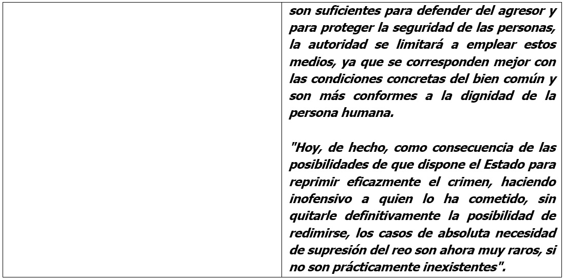 El número 2267, por su parte, establecía que el empleo de medios cruentos debe quedar reservado para los casos en que no es posible por otro medio defender del agresor las vidas humanas y el orden público.