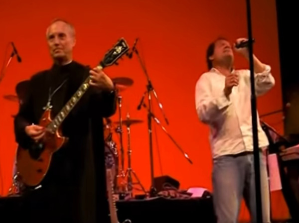 Por encima, en la foto, se ve el Abad Primado de la Orden Benedictina Notker Wolf tocando con una banda de rock. ¿Qué canción están tocando? Es Autopista al infierno , la famosa canción de rock de la banda australiana AC / DC.