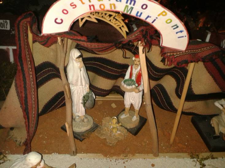 El portal de Belén es una jaima beduina con la inscripción «Vamos a construir puentes, no muros»