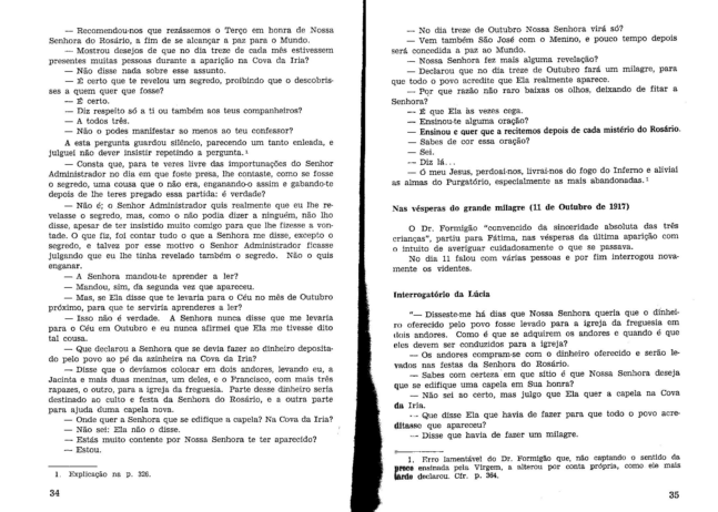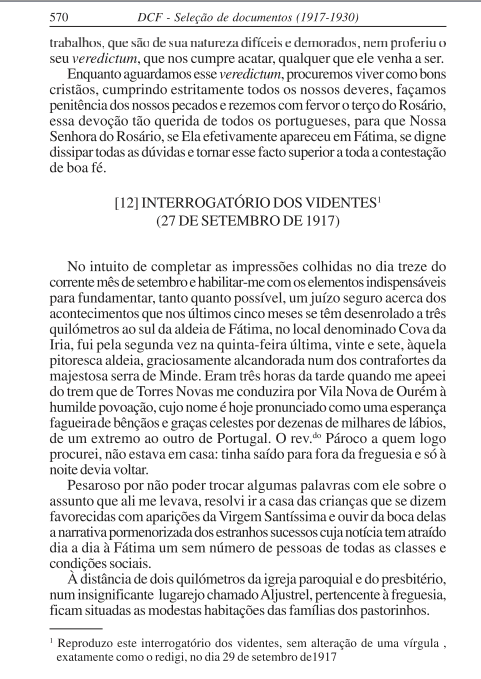 En la página 570, se extrae la narración de la entrevista hecha a los videntes por el Padre Nunez Formigao, con una nota al pie que da fuerzas a la primera versión de la oración.