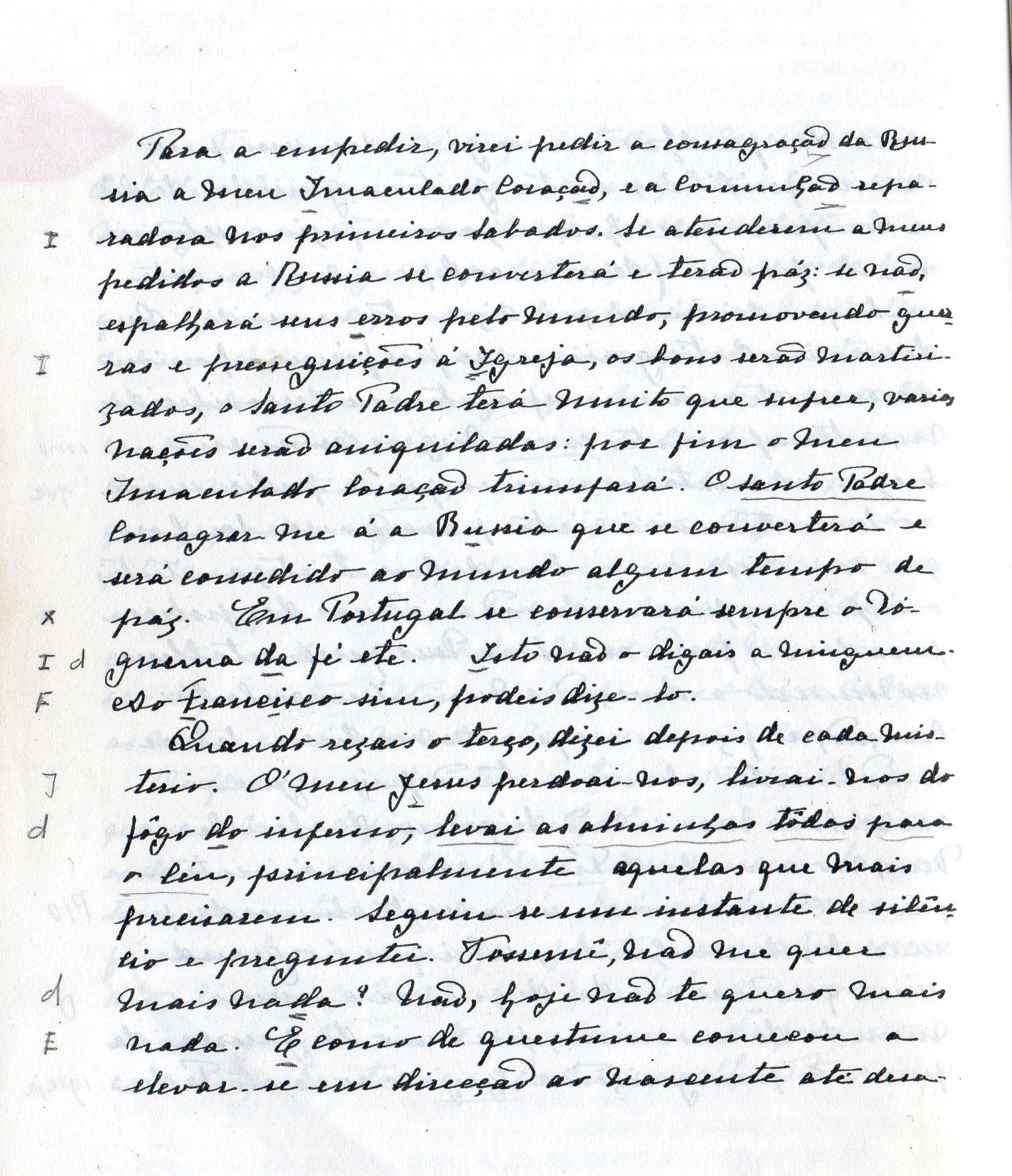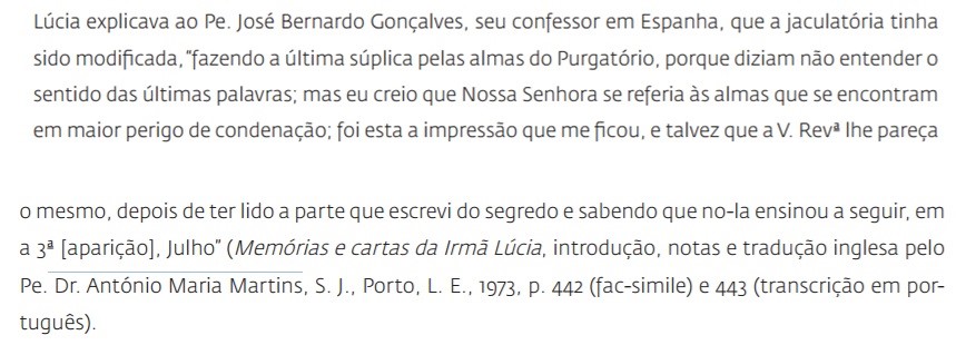 Y así le di la posible publicidad y es así conocida en todas partes. Mas tarde la revelación de la primera parte del secreto registrada en los manuscritos de la hermana Lucía (la visión del infierno y las particularidades íntimas de esta) me permitieron dar la debida interpretación a la jaculatoria transmitida por los videntes.