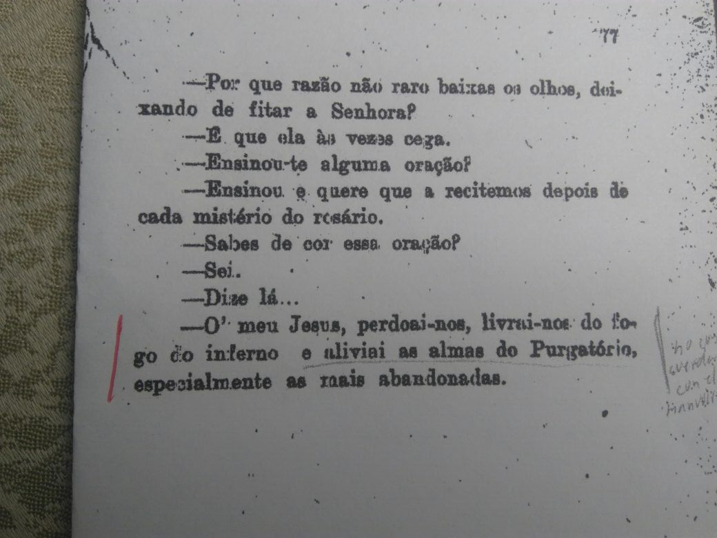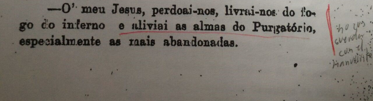 “O meu Jesus perdoai-nos, livrai-nos do fogo do inferno, levai as alminhas todas para o Ceu, principalmente aquelas que mais precisarem”