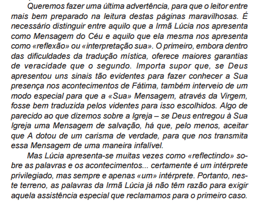 Queremos hacer una última advertencia, para que el lector entre mejor preparado en la lectura de estas páginas maravillosas. Es necesario distinguir entre aquello que Sor Lucía nos presenta como mensaje del cielo y aquello que nos presenta como “reflexión” o “ su interpretación”. Lo primero, aunque dentro de las dificultades de la traducción mística, ofrece mayores garantías que la veracidad de lo segundo. Es de suponer que, si Dios presentó señales tan evidentes para hacer conocer Su presencia en los acontecimientos de Fátima, también intervino de un modo especial para que “Su” mensaje, a través de la Virgen, fuese bien traducido por los videntes para esto escogidos….