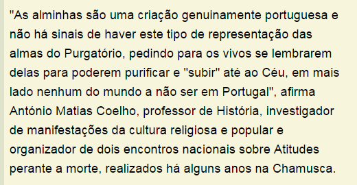 “Las “alminhas” son una creación genuinamete portuguesa y no hay señales de este tipo de representaciones de las almas del Purgatorio, pidiendo que los vivos se acuerden de ellas para poder purificarse y “subir” al cielo, en ningún otro lugar del mundo a no ser en Portugal”, afirma Antonio Matías Coelho, profesor de historia, investigador de manifestaciones de la cultura popular y organizador de dos encuentros nacionales sobre actitudes frente a la muerte, realizados hace unos años en Chamusca.