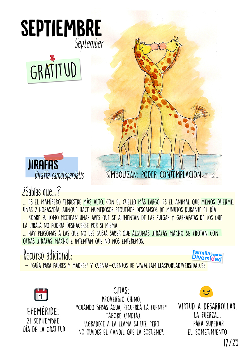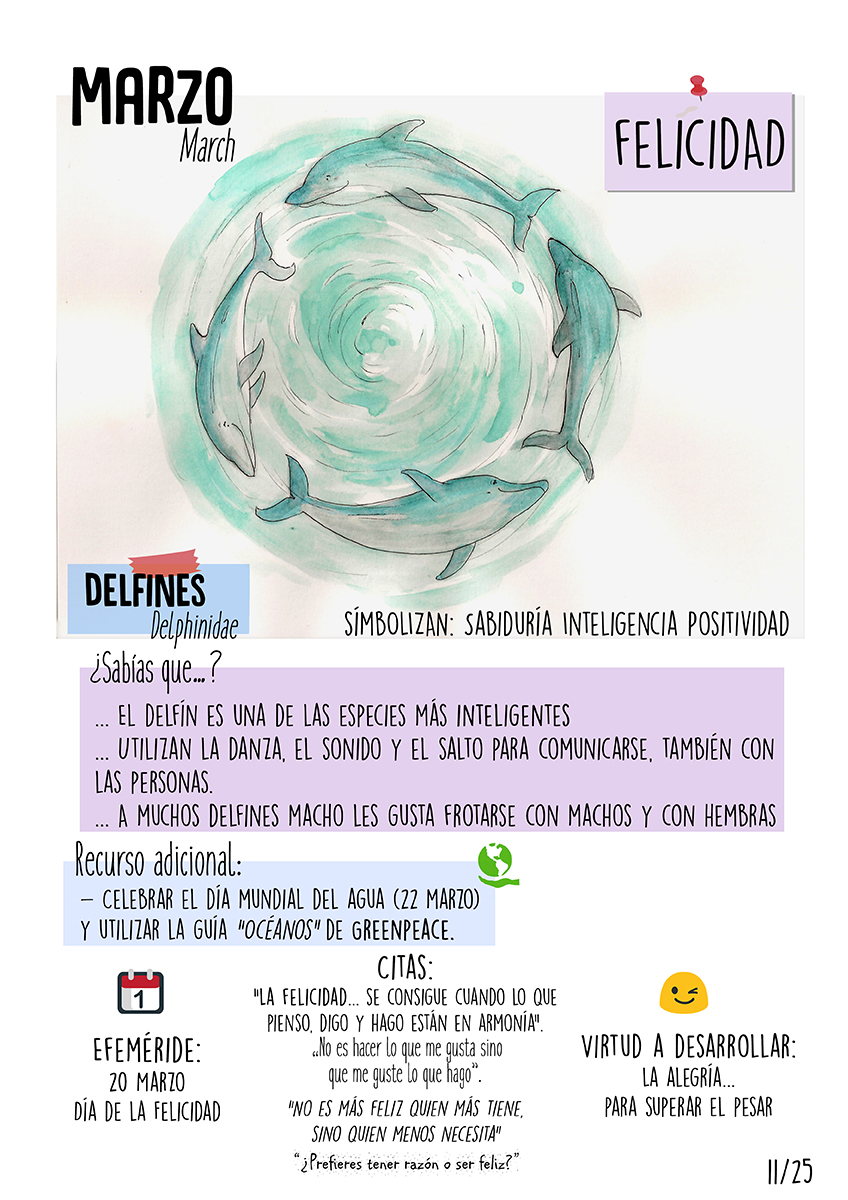 Las diferentes efemérides son algunas como el día de la Felicidad, día de la Diversidad o el día de la Sonrisa, una por mes. Además, tendrá una cita de algún personaje histórico.