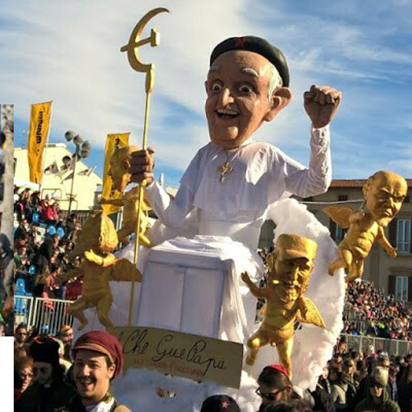 El Carnaval de Viareggio es famoso por su humor y vivacidad. Este año de 2017 entre los flotadores era uno dedicado a Decimejorge. Se le representa como un comunista.