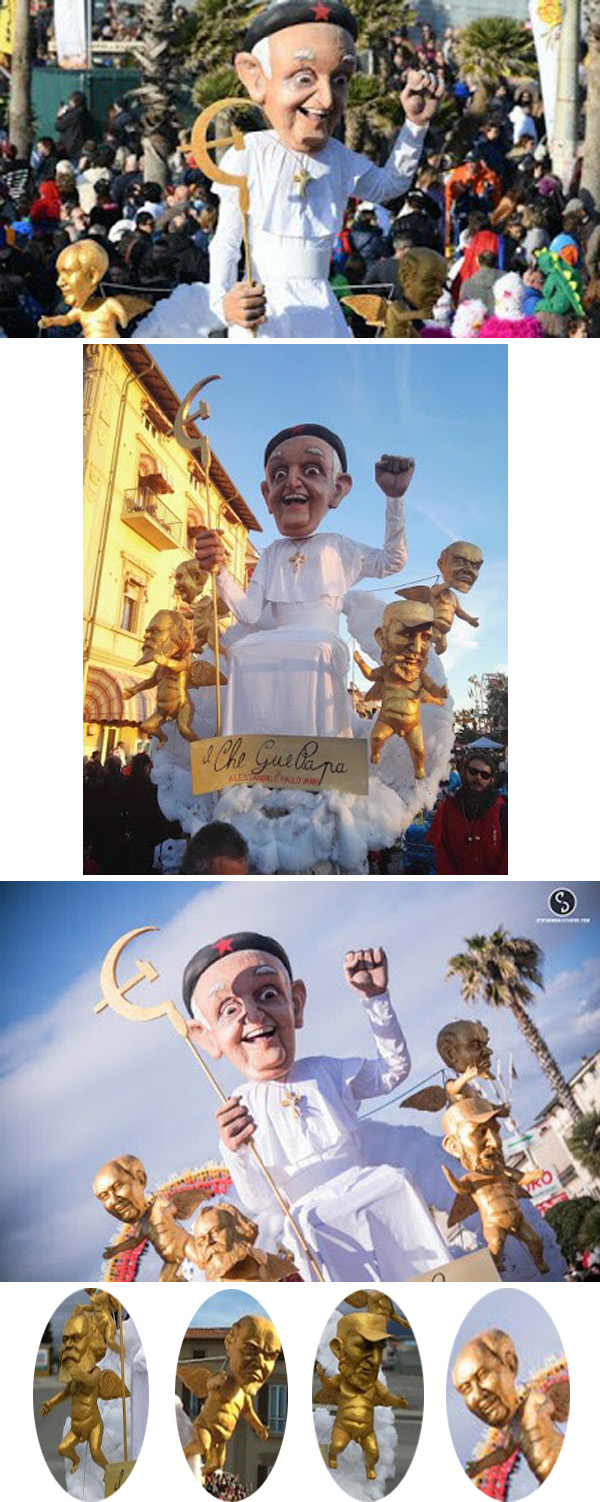 La figura de Bergoglio sentado en una nube también podría estar de pie, como se muestra en la primera fila de abajo , y los jefes » ángeles» balanceandose arriba y abajo para saludar al público. El flotador se llamó «El Che GuePapa», un juego de palabras en el nombre de Che Guevara.