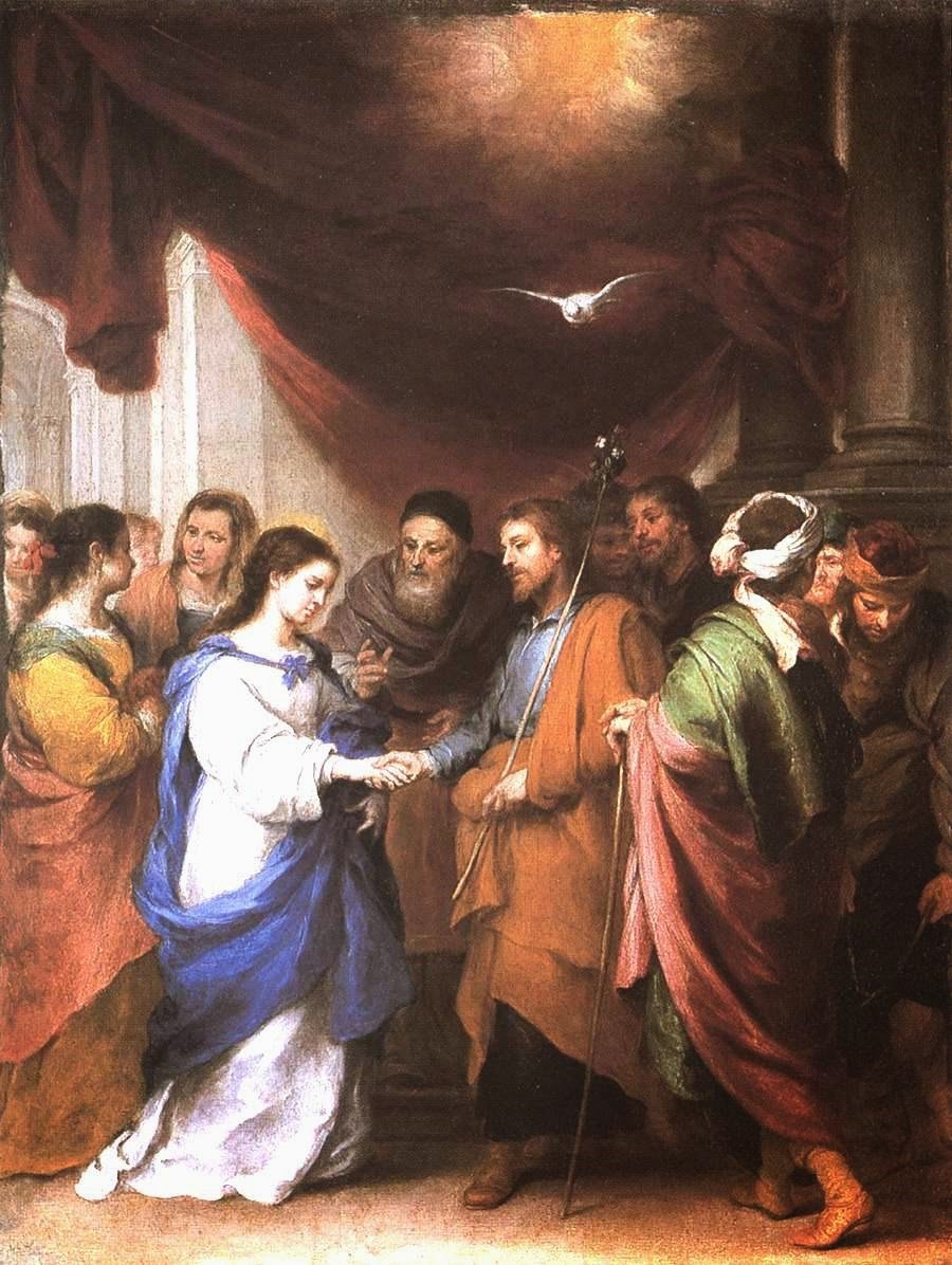 Hallándose los sacerdotes embarazados para la elección, a consecuencia de los numerosos pretendientes, recurrieron la oración, y el cielo les respondió con una inspiración: esta decía, que todos los jóvenes debían tener en sus manos varas secas, y aquel cuya vara floreciese sería elegido. La orden fue ejecutada, y puestos todos en oración, la vara de José floreció en sus manos, y una blanca paloma vino a colocarse en su cabeza. Convencidos por este milagro de los designios de Dios sobre san José, los sacerdotes enviaron a buscar a la joven María, que sólo consintió en ese enlace por obediencia: la noticia del milagro debió causar en ella una grande alegría, porque pensó que ya el cielo le enviaba tan visiblemente a San José por esposo, el cielo sabría inspirar respeto a su voto de virginidad, y hacerle solamente un custodio y un apoyo para ella.
