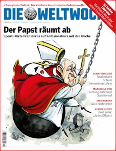 Montando una enorme bola de metal utilizada para demoler edificios, Francisco se representa en la portada de la revista semanal alemana Die Weltwoche – Semana del mundo – en su reciente edición n. 14. La bola de demolición está en el proceso de golpear edificios de la iglesia que ya están medio rotos. Los titulares de la tapa se leen: El Papa limpia – Espontánea Francisco choca con la Iglesia .