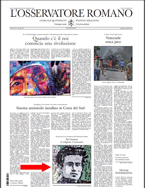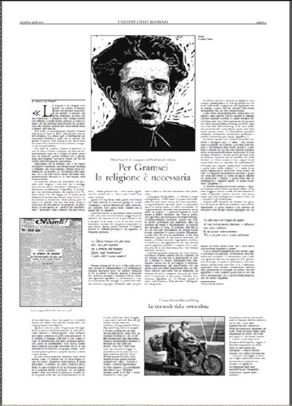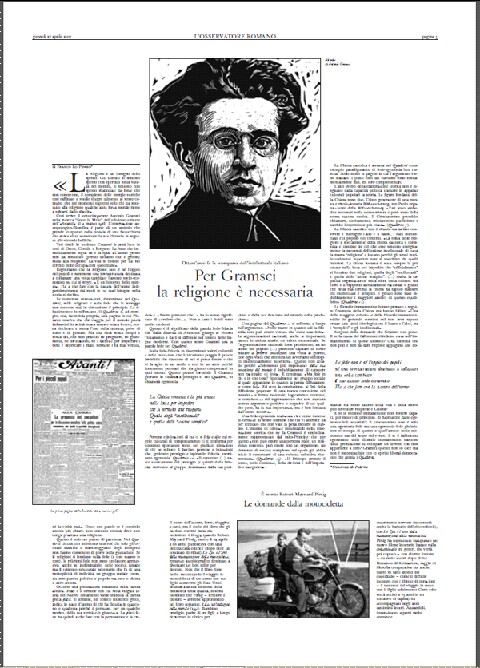 El 27 de abril de 2017, L’Osservatore Romano , el diario de la Santa Sede, dedica un gran espacio para celebrar el 80 aniversario de la muerte del comunista Antonio Gramsci.
