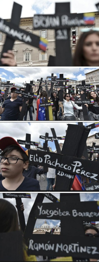 El domingo 7 de mayo de 2017, un grupo de venezolanos hizo una protesta silenciosa contra la inacción de Bergoglio con respecto a la grave crisis en su país. Los activistas realizaron cruces negras con los nombres y las edades de los injustamente asesinados por la policía.