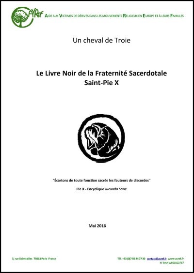 La Asociación Ayuda a Víctimas y Familiares de Movimientos Religiosos en Europa (AVREF, siglas en francés, traducción al castellano mía), ha editado un libro llamado EL LIBRO NEGRO DE LA SOCIEDAD SACERDOTAL DE SAN PÍO X. El libro relata en sus primeras 10 páginas la historia de la FSSPX, luego la relación de Mons. Fellay con unas familias “privilegiadas” y muy cercanas al hijo maldito y traidor de Fellay. Luego relata en resumen los abusos de los sacerdotes “M”, “S” (Stephen Abraham), “P” (Philippe Peignot), Abbet y Roisnel.