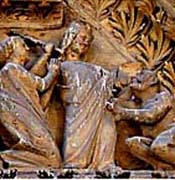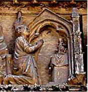 El escultor que reproduce la historia de Teófilo tenía un gran talento, porque las escenas son realmente expresivas. Analicemos solamente el decisivo momento en el que la Virgen obliga a la devolución del documento que entrega el alma de Teófilo al diablo.