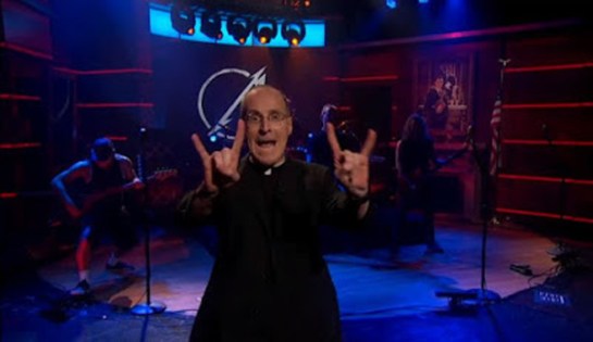 Por encima , se lo ve el 24 de septiembre de 2013, haciendo el símbolo de «Satanás sea alabado» después de haber sido entrevistado por Colbert Report , que después pasó a entrevistar a los miembros de la banda de rock heavy metal Metallica.