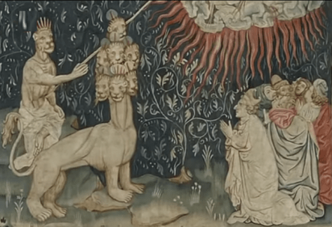 “1Y del mar vi subir una bestia con diez cuernos y siete cabezas, y en sus cuernos diez diademas, y en sus cabezas nombres de blasfemia. 2(…) y el dragón le pasó su poder y su trono y una gran autoridad. (…) 4Y adoraron al dragón, porque él había dado la autoridad a la bestia; y adoraron a la bestia (…) 5 Y se le dio una boca que profería altanerías y blasfemias; (…) 6Abrió, pues, su boca para blasfemar contra Dios, blasfemar de su Nombre, de su morada y de los que habitan en el cielo. 7Le fue permitido también hacer guerra a los santos y vencerlos; y le fue dada autoridad sobre toda tribu y pueblo y lengua y nación. 8Y lo adorarán (al dragón) todos los moradores de la tierra, aquellos cuyos nombres no están escritos, desde la fundación del mundo, en el libro de la vida del Cordero inmolado. 9Si alguno tiene oído, oiga: 10si alguno ha de ir al cautiverio, irá al cautiverio; si alguno ha de morir a espada, a espada morirá. En esto está paciencia y la fe de los santos.” (Apoc. XIII, 1- 10)
