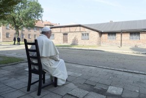 Francisco sentado frente a un barracón de Auschwitz