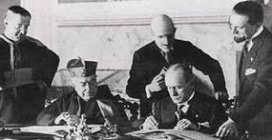 Mussolini firmando los documentos del Tratado de Letrán
